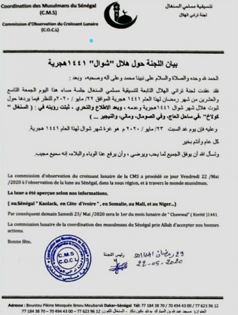 Par conséquent, la Coordination des musulmans du Sénégal qu’elle prie ce samedi, “samedi 23 mai 2020, qui sera le premier jour du mois de ‘Chawal’ 1441”.