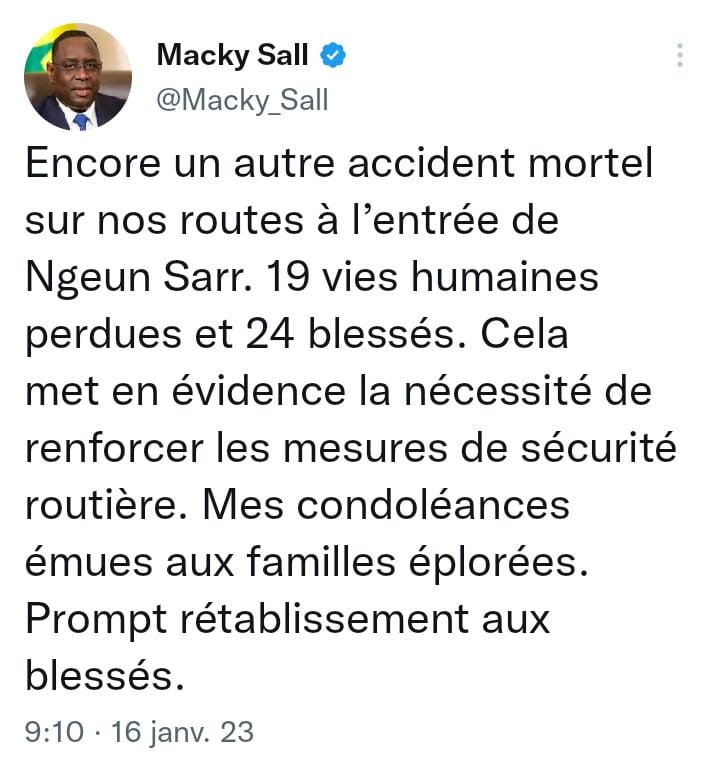 Le chef de l’Etat a rapidement réagi à l’accident survenu ce matin à Sakkal tuant 19 personnes et faisant 24 blessés. Selon Macky Sall qui a présenté ses condoléances, cela met en évidence la nécessité de renforcer les mesures de sécurité routière.