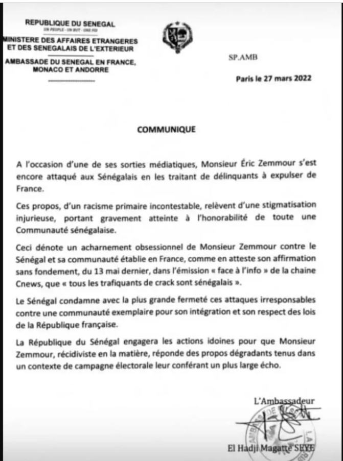 Dans ses propos, contenus dans une note de l’ambassadeur, Zemmour qualifie les Sénégalais de délinquants à expulser de France. Ce qui dénote, selon le diplomate, El Hadj Maguette Sèye d’un “acharnement obsessionnel contre le Sénégal et sa communauté établie en France”. En ce sens que Zemmour reste un récidiviste en la matière. Il rappelle que “dans l’émission face à l’info sur Cnews, le 13 mai dernier, Zemmour avait affirmé que tous les trafiquants de Crack en France sont des Sénégalais”.