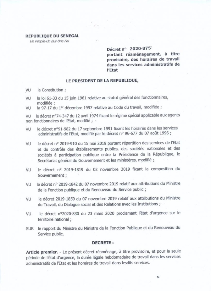 Le communiqué indique que désormais, les horaires sont fixés de 9 heures à 15 heures. Le texte souligne que cette décision est relative aux nouvelles mesures en vigueur dont l’état d’urgence décrété par le chef de l’Etat Macky Sall pour freiner la propagation du Coronavirus dans le pays.