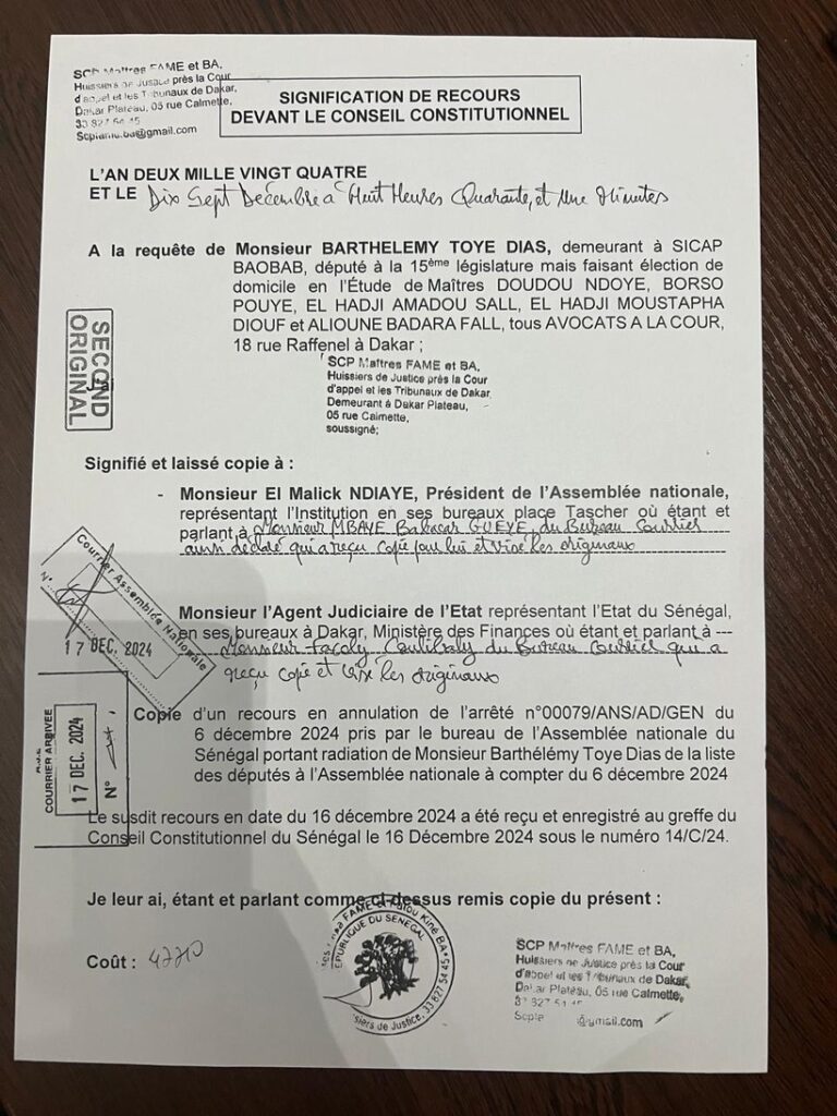 Les avocats de Barthélémy Dias ont déposé deux recours au Conseil constitutionnel et à la Cour d’appel de Dakar visant à annuler l’arrêté pris par le bureau de l’Assemblée nationale et l’arrêté préfectoral qui a déclaré le maire de la ville de Dakar démissionnaire de son poste de Conseiller municipal.