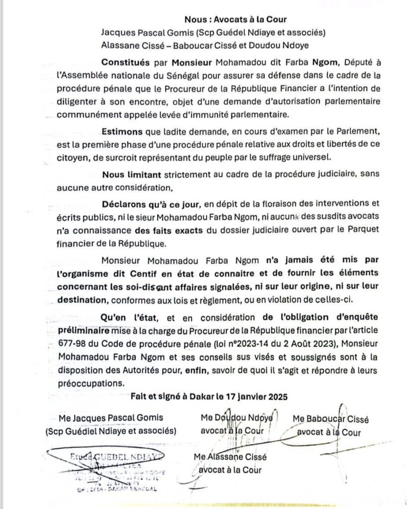 En conférence de presse, ce vendredi 18 janvier 2025, la défense du député Farba ont laissé entendre qu’ils savent toujours pas ce qui est reproché à leur client.