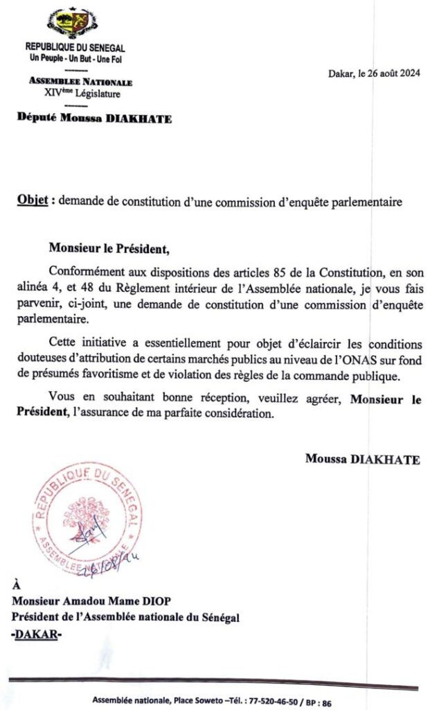 Comme promis le parlementaire Moussa Diakhaté a déposé une lettre sur la table du président de l’Assemblée nationale. L’objectif est de constituer une commission d’enquête parlementaire pour éclairer la lanterne des Sénégalais sur l’affaire de l’Office national d’assainissement.