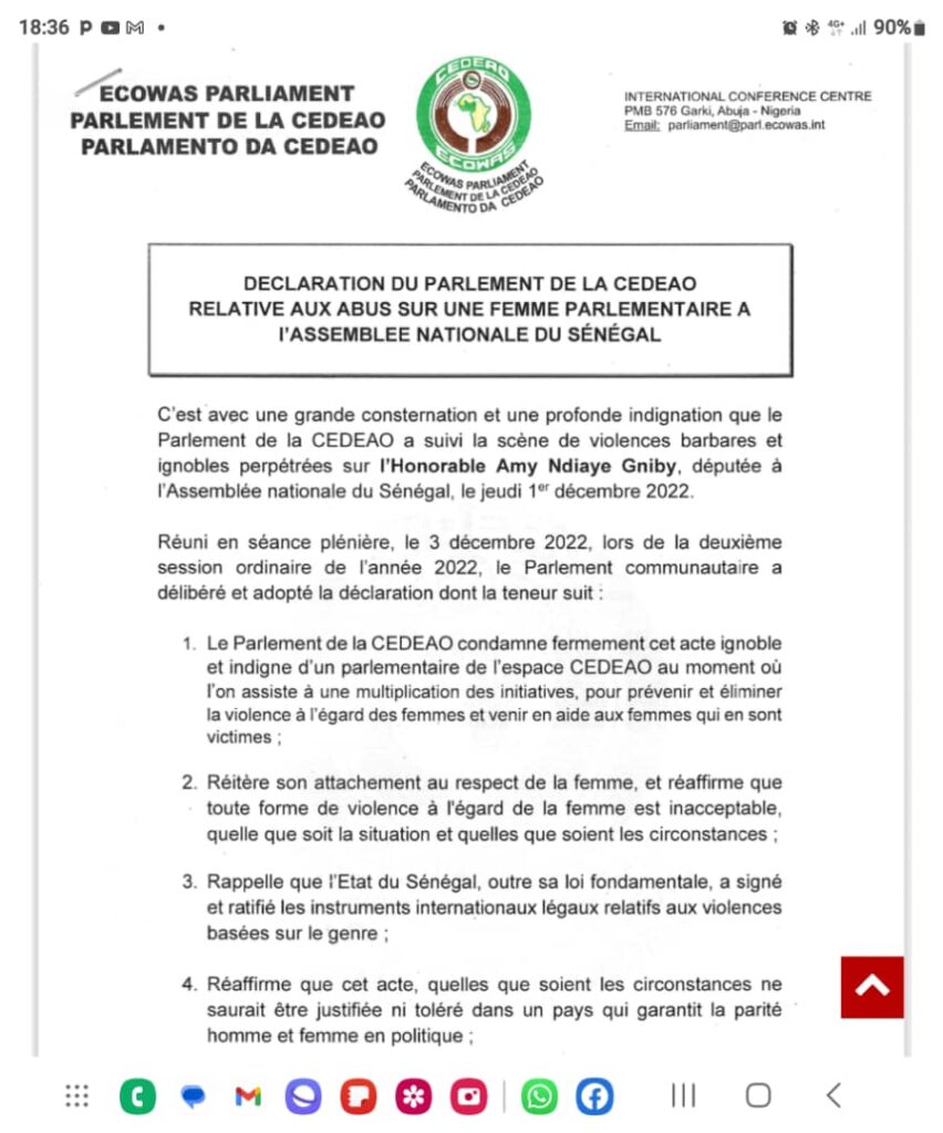 Dans un communiqué qu’il a rendu public le parlement de la CEDEAO souligne que c’est avec une grande consternation et une profonde indignation qu’il a suivi la scène de « violences barbares et ignobles » perpétrées sur l’honorable Amy Ndiaye Gniby, députée à l’Assemble nationale du Sénéagl le jeudi 1er décembre 2022.