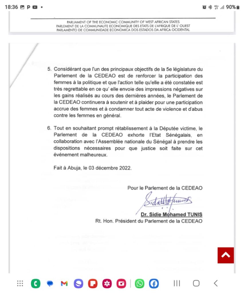 Le parlement de la CEDEAO réitère son attachement au respect de la femme et réaffirme que toute forme de violence à l’égard de la femme est inacceptable quelle que soient les circonstances. Il rappelle que l’Etat du Sénégal, outre sa loi fondamentale, a signé et ratifié les instruments internationaux légaux relatifs aux violences basées sur le genre.