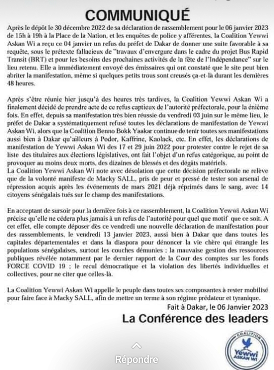 Dans un communiqué la coalition Yewwi Askan Wi prend acte de l’interdiction de son rassemblement pour le 06 janvier 2023 de 15h à 19h à la Place de la Nation par le Préfet de Dakar, sous prétexte de « travaux d’envergure dans le cadre du projet Bus Rapid Transit (BRT) et pour les besoins des prochaines activités de la fête de l’Indépendance » sur le lieu retenu. Même si c’est un prétexte « fallacieux ».