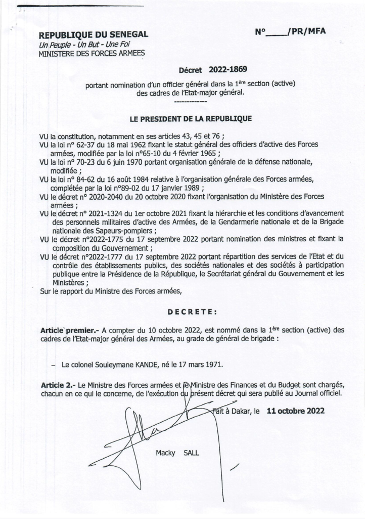 Le Général Souleymane Kandé, ancien commandant des opérations spéciales devient le chef d’État-major de l’armée de terre. Il remplace le Général de brigade Philippe Alfred Dia. C’est du moins la substance d’un décret signé par le Président de la République et rendu public ce mercredi 12 octobre 2022.