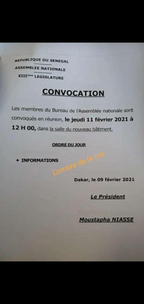 Les membres du bureau de l’Assemblée nationale sont convoqués en réunion, le jeudi 11 février à 12 heures, dans la salle de conférence du nouveau bâtiment.