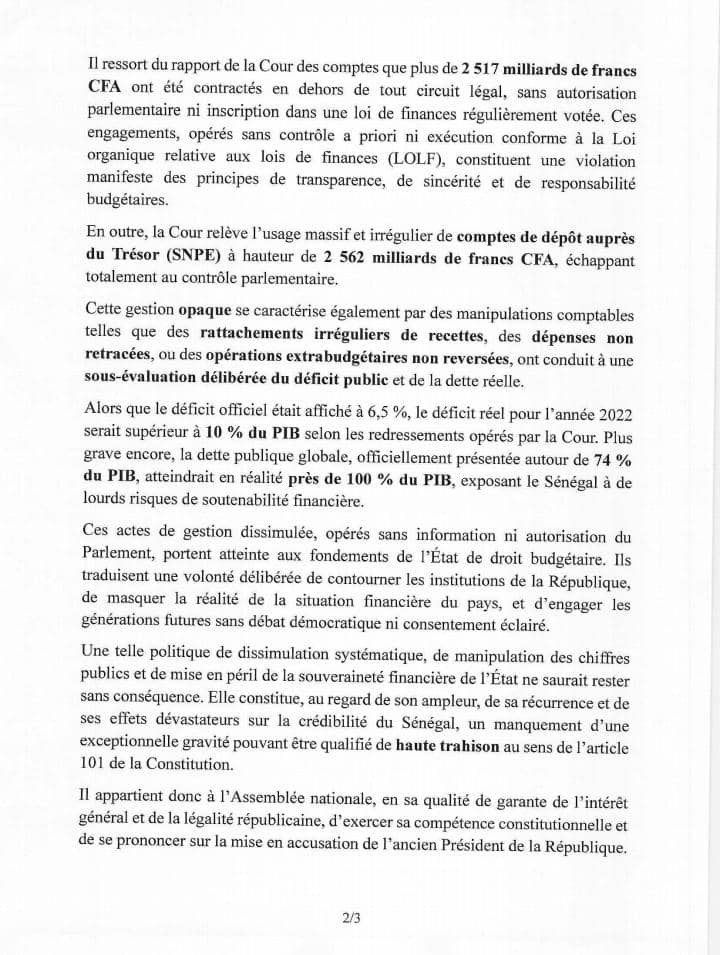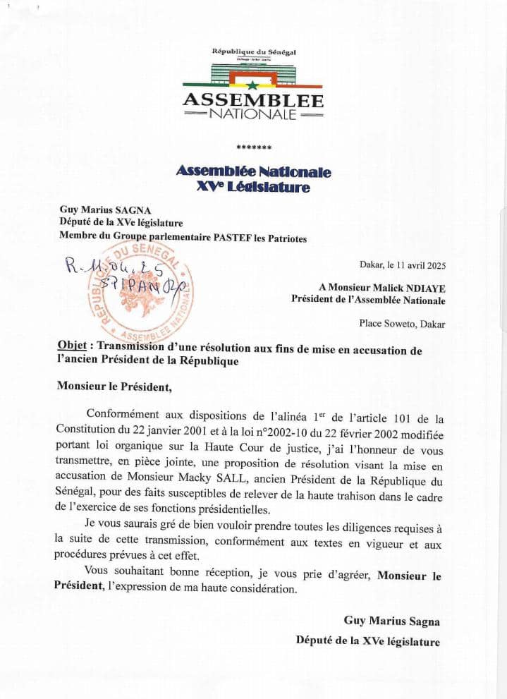 Guy Marius Sagna, député membre de Pastef (pouvoir) a proposé une résolution portant mise en accusation de Macky Sall pour haute trahison devant la Haute cour de justice.