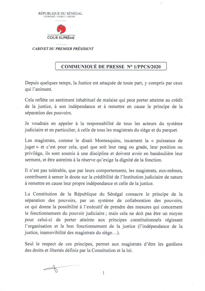 Le premier président de la Cour suprême n’est pas d’accord avec les attaques dont la justice fait face en ce moment. Dans ce document, ci-dessous, Cheikh Ahmed Tidiane Coulibaly s’en insurge et appelle à la responsabilité des acteurs du système judiciaire.