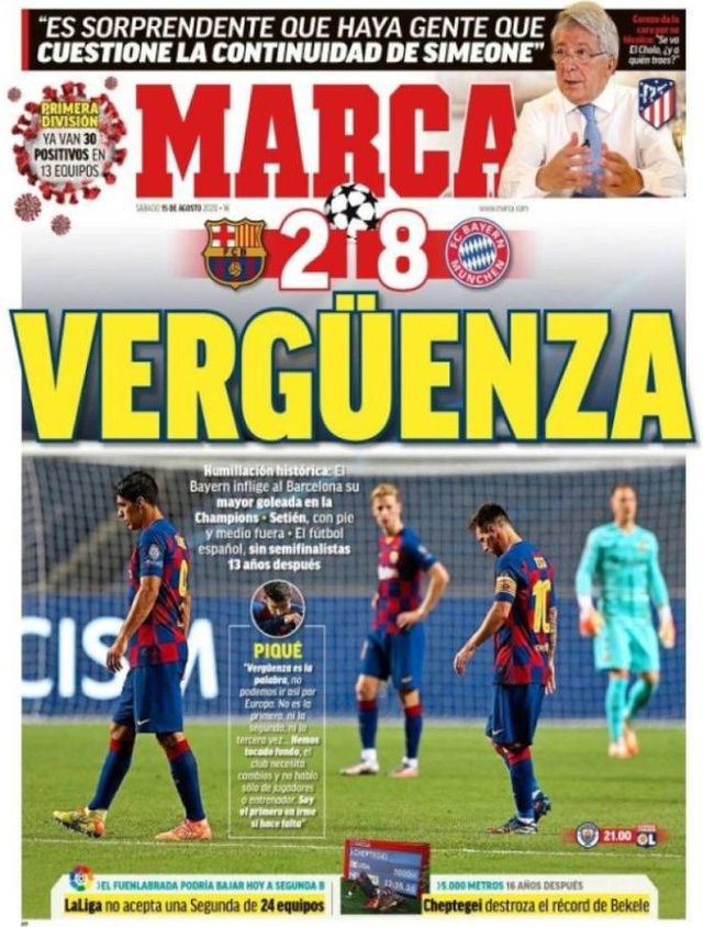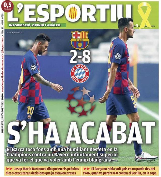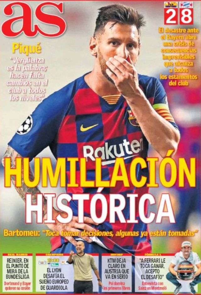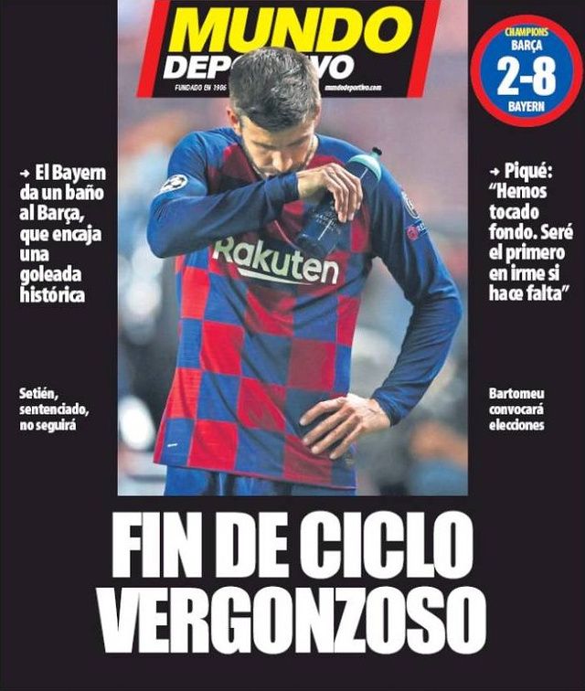 Les médias catalans, habitués à soutenir leurs préférés, n’ont rien pu faire pour les sauver de cette déroute. Sport titre même «Humiliation historique» avec une illustration de La Pulga, tête baissée, complètement dépassée par les événements. Les déclarations fortes de Gerard Piqué et Josep Maria Bartomeu ont été affichées en bas de page sur un fond noir, comme pour évoquer le deuil suite à ce fiasco retentissant. Même son de cloche pour Mundo Deportivo, qui évoque la «fin d’un cycle honteux» . Fond noir, déclarations chocs et une photo de Piqué, abattu tel un boxeur qui vient de prendre un KO, le plus grand média catalan n’y est pas allé par quatre chemins, alors que L’Esportiu titre plus sobrement «C’est fini» , avec une photo de Messi et de Sergio Busquets, sous le choc après les pires 90 minutes de leur carrière.