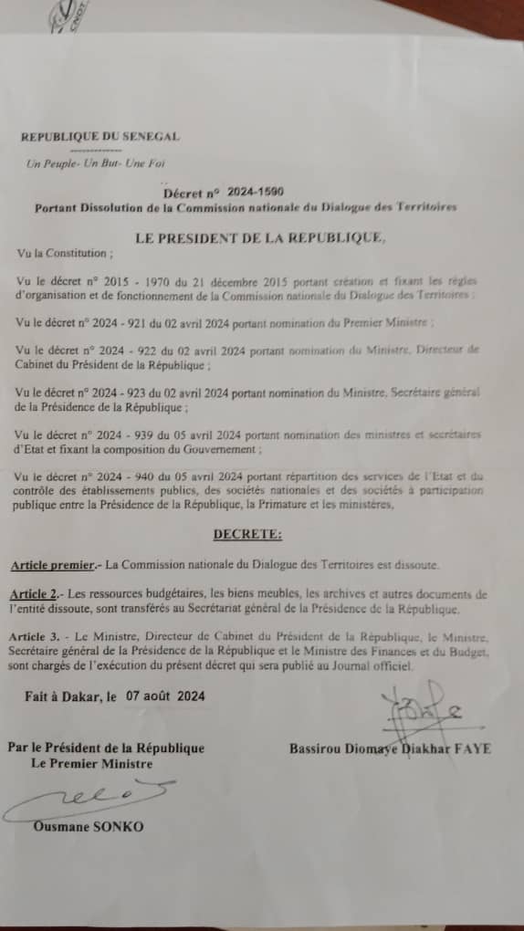 La commission Nationale du Dialogue des Territoires (CNDT) a été dissoute par décision du Président Bassirou Diomaye Faye.