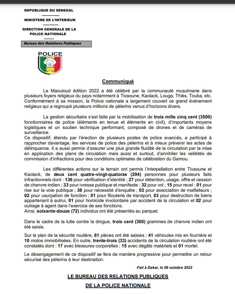 Revenant sur le bilan de l’édition 2022 du Gamou, le Bureau des Relations Publiques de la Police nationale révèle que les actions menées sur le terrain ont permis l’interpellation entre Tivaouane et Kaolack, de deux cent quatre-vingt-quatorze (294) personnes pour plusieurs infractions dont : 136 pour vérification d’identité ; 27 pour détention, usage, offre et cession de chanvre indien ; 33 pour ivresse publique manifeste ; 32 pour vol ; 15 pour recel ; 01 pour rixe sur la voie publique ; 38 pour nécessité d’enquête ; 03 pour association de malfaiteurs ; 02 pour usurpation de fonction ; 01 pour filouterie de transport; 03 pour destruction de biens appartenant à autrui; 01 pour homicide involontaire par accident de la circulation et 02 pour outrage à agent dans l’exercice de ses fonctions.