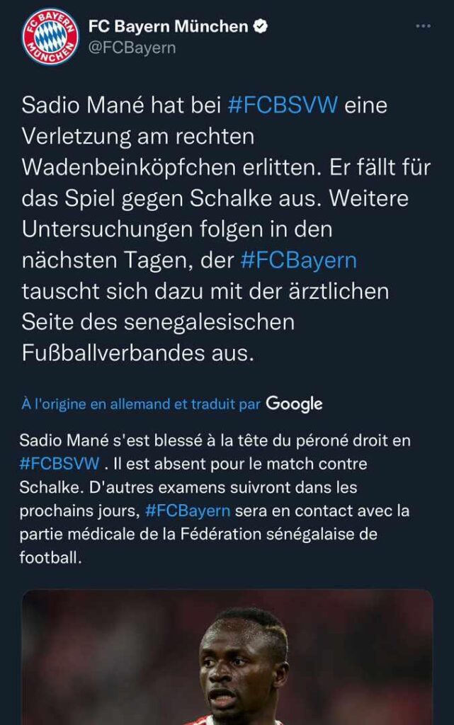 Le club de Sadio Mané, Bayern de Munich, a donné sa version officielle sur la blessure de Sadio Mané sans entrer dans les détails. “Sadio Mané s’est blessé à la tête du péroné. Il est absent pour le match contre Schalke. D’autres examens suivront dans les prochains jours”, peut-on lire. Et de poursuivre que “le Fc Bayern restera en contact avec la partie médicale de la fédération sénégalaise de football”