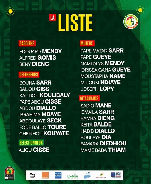 L’entraîneur de l’équipe nationale de football, Aliou Cissé, a dévoilé, ce vendredi 24 décembre, une liste de 27 joueurs devant défendre les couleurs du Sénégal à la Coupe d’Afrique des Nations, qui se déroulement au Cameroun. A part Krépin Diatta, absent pour raison de blessure, Aliou Cissé a repris les mêmes qui ont joué les éliminatoires.