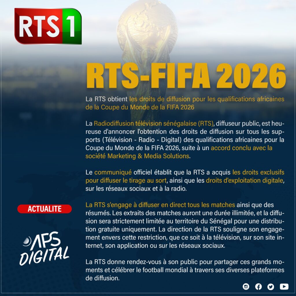La Radiodiffusion télévision sénégalaise (RTS), diffuseur public, est heureuse d’annoncer l’obtention des droits de diffusion sur tous les supports (Télévision – Radio – Digital) des qualifications africaines pour la Coupe du Monde de la FIFA 2026, suite à un accord conclu avec la société Marketing & Media Solutions.