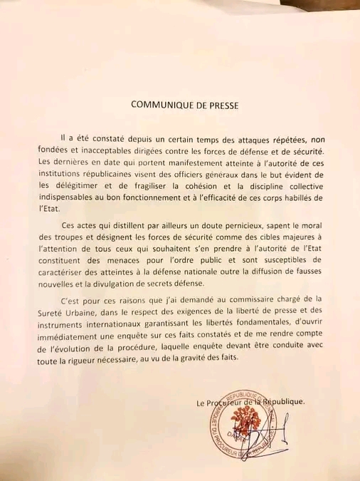”Il a été constaté depuis un certain temps des attaques répétées, non fondées et inacceptables dirigées contre les forces de défense et de sécurité. Les dernières en date qui portent manifestement atteinte à l’autorité de ces institutions républicaines visent des officiers généraux dans le but évident de les délégitimer et de fragiliser la cohésion et la discipline collective indispensables au bon fonctionnement et à l’efficacité de ces corps habillés de l’Etat.