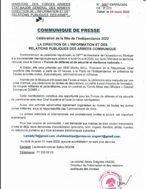 Dans un communiqué, ci-dessous, de l’Armée dont nous avons reçu copie, la Direction des relations publiques de l’Armée (Dirpa) informe que le 62e anniversaire de l’accession à la souveraineté internationale sera célébré le 4 avril 2022 sur toute l’étendue du territoire national sous le thème “Forces et de sécurité et résilience nationale”. A Dakar, le défilé sera présidé à partir de 10h à la place de l’Indépendance.