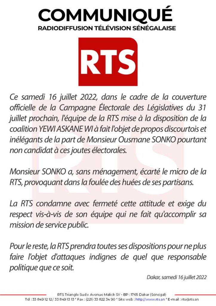 Actualités Politique Comportement de Sonko : la RTS contre-attaque 17 juillet 202217 juillet 2022 jotalixibar Partager l'article Communiqué de la Rts sur la couverture médiatique de la coalition Yewwi askan wi Partager : Cliquer pour partager sur X(ouvre dans une nouvelle fenêtre) X Cliquez pour partager sur Facebook(ouvre dans une nouvelle fenêtre) Facebook Cliquez pour partager sur WhatsApp(ouvre dans une nouvelle fenêtre) WhatsApp Share Facebook Twitter Pinterest Linkedin
