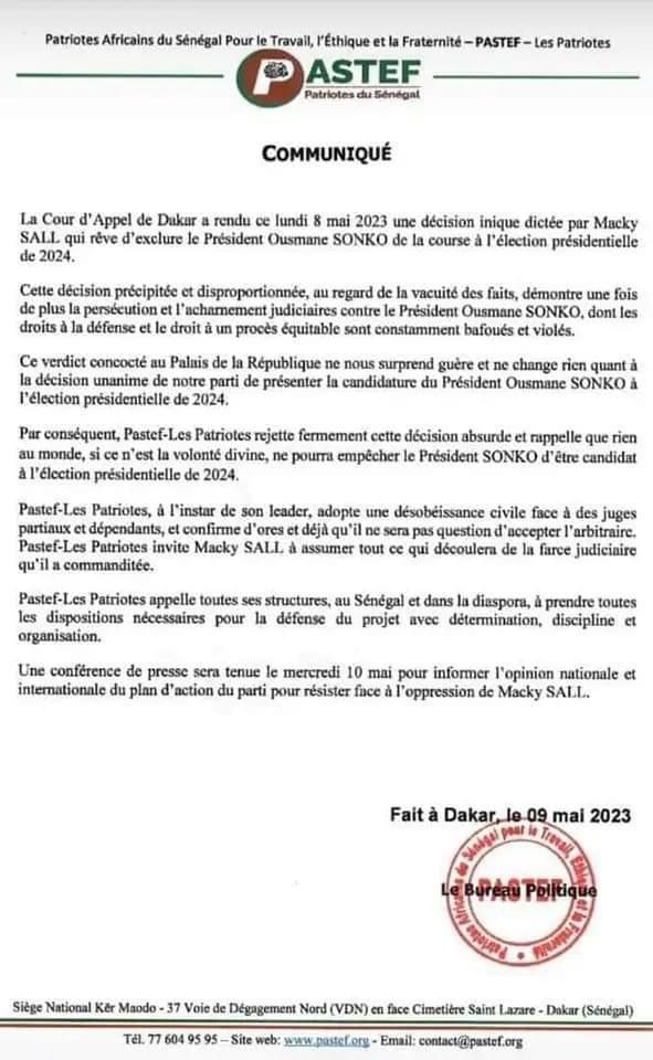 Pastef estime que le verdict a été ‘’concocté au palais de la République’’, ‘’dictée par Macky Sall’’ pour éliminer Ousmane Sonko de la présidentielle . Rien au monde, si ce n’est la volonté divine, ne pourra empêcher le président Sonko d’être candidat à l’élection présidentielle de 2024″, a-t-il dit.