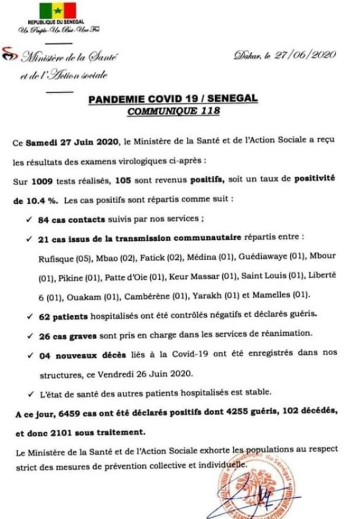 Sur 1009 tests réalisés, 105 sont revenus positifs au coronavirus soit un taux de positivité de 10,4%. Selon le ministre de la Santé, Abdoulaye Diouf Sarr, il s’agit de 84 cas contacts suivis et 21 cas issus de la transmission communautaire répartis comme suit : Rufisque (5), Mbao (2), Fatick (2), Médina (1), Patte d’Oie (1), Liberté 6 (1), Ouakam (1), Cambérène (1), Yarakh (1), Mamelles (1), Pikine (1), Guédiawaye (1), Keur Massar (1), Mbour (1) et Saint-Louis (1). 62 patients ont été testés négatifs et déclarés guéris. 26 cas graves sont pris en charge dans les services de réanimation. 4 nouveaux décès liés à la Covid-19, enregistrés. A ce jour, le Sénégal compte 6459 cas positifs dont 4255 guéris, 102 décès et 2101 encore sous traitement.