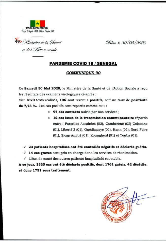 Sur 1370 tests réalisés, 106 sont revenus positifs au coronavirus soit un taux de positivité de 7,73%. Selon le ministre de la Santé, Abdoulaye Diouf Sarr, il s’agit de 94 cas contacts suivis et 12 cas issus de la transmission communautaire répartis comme suit : Parcelles Assainies (2), Cambérène (2), Colobane (1), Liberté 3 (1), Guédiawaye (1), Hann (1), Nord Foire (1), Sicap Amitié (1), Koungheul (1) et Touba (1).