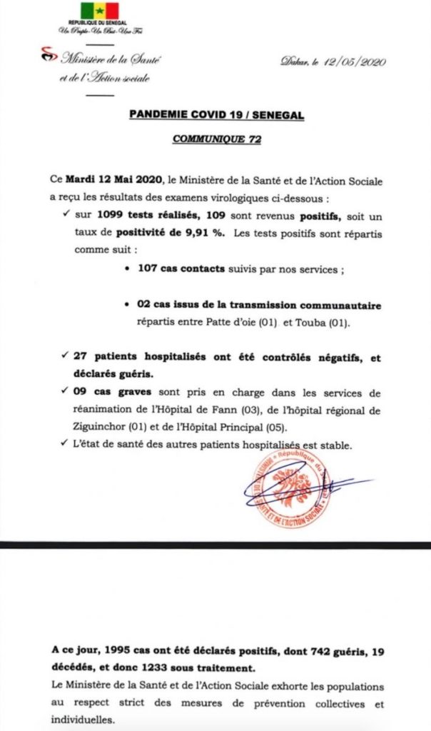 Sur 1099 tests réalisés, 109 sont revenus positifs au coronavirus soit un taux de positivité de 9,91%. Selon le ministre de la Santé et de l’Action sociale, Abdoulaye Diouf Sarr, il s’agit de 107 cas contacts suivis et 2 cas issus de la transmission communautaire répartis comme suit : Patte d’Oie (1) et Touba (1). 27 patients ont été testés négatifs et déclarés guéris. Le chef du département de la Santé a ajouté que 9 cas graves sont pris en charge dans les services de réanimation à Fann (3), l’hôpital Principal (4) et l’hôpital de Ziguinchor (1). A ce jour, le Sénégal compte 1995 cas positifs dont 742 guéris, décès, 1 évacué et 1233 encore sous traitement, a-t-il précisé.