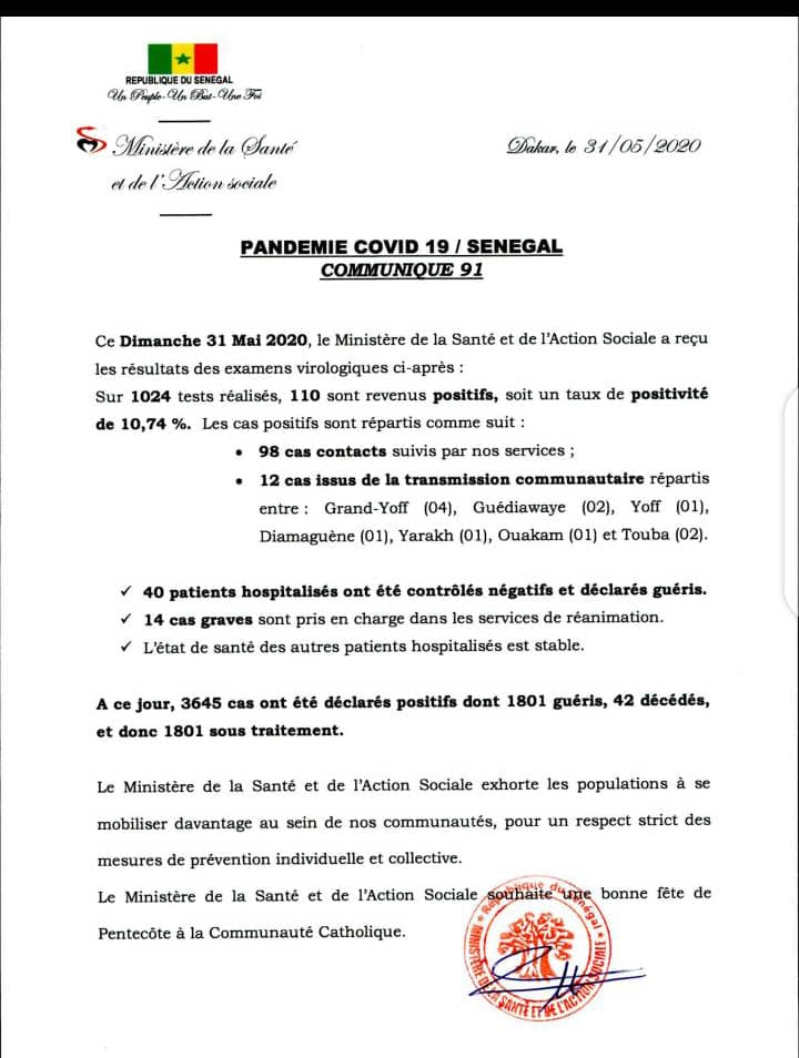 Sur 1024 tests réalisés, 110 sont revenus positifs au coronavirus soit un taux de positivité de 10,74 %. Selon Dr Aloyse Diouf, il s’agit de 98 cas contacts suivis et 12 cas issus de la transmission communautaire répartis comme suit : Grand Yoff (4), Guédiawaye (2), Yoff (1), Diamaguène (1), Yarakh (1), Ouakam (1) et Touba (2).