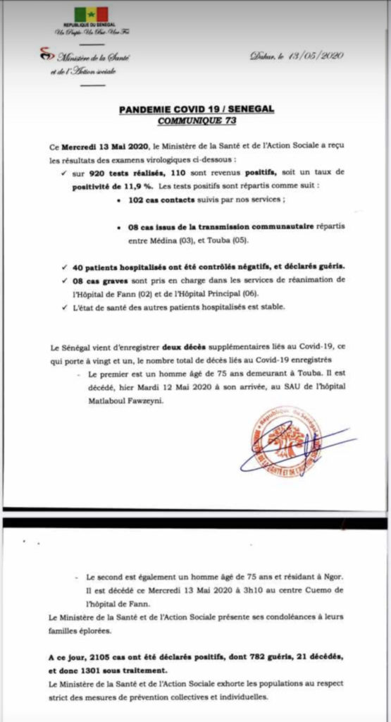 Sur 920 tests réalisés, 110 sont revenus positifs au coronavirus soit un taux de positivité de 11,9%. Selon Dr Marie Khémesse Ngom, il s’agit de 102 cas contacts suivis et 8 cas issus de la transmission communautaire répartis comme suit : Médina (3) et Touba (5). 40 patients ont été testés négatifs et déclarés guéris. Elle a précisé que 8 cas graves sont pris en charge dans les services de réanimation à Fann (2), l’hôpital Principal (6).