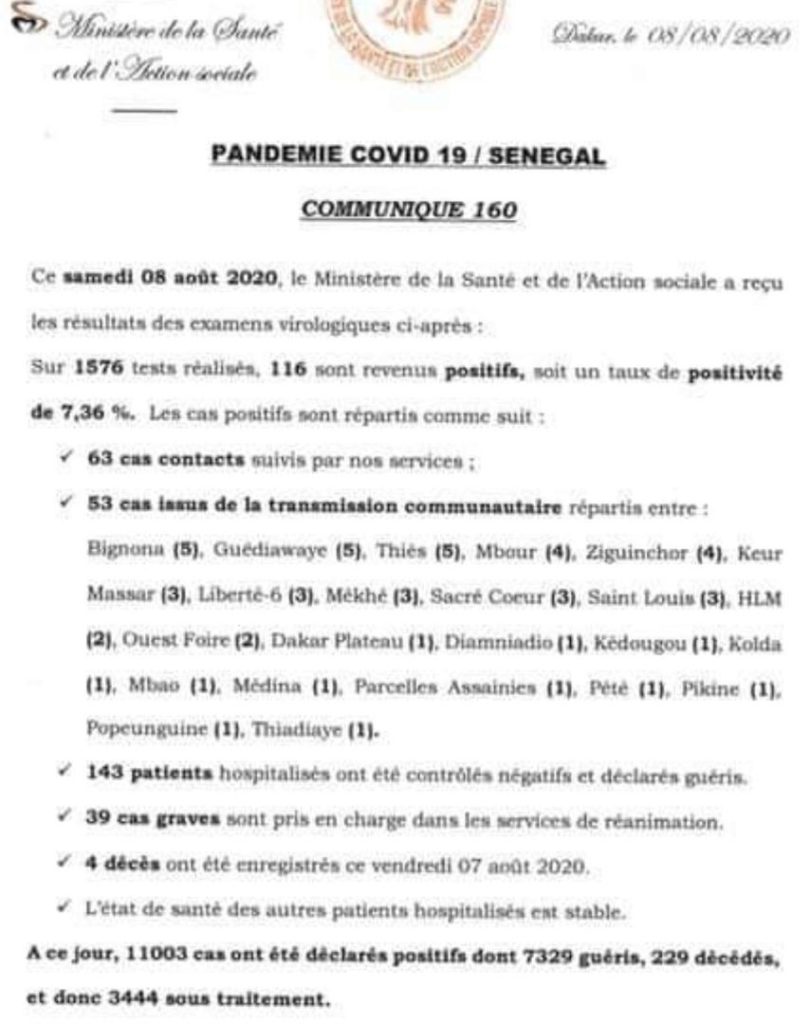 Sur 1576 tests réalisés, 116 sont revenus positifs au coronavirus soit un taux de positivité de 10,05 %. Il s’agit de 63 cas contacts suivis et 53 cas issus de la transmission communautaire répartis comme suit : Bignona (5), Guédiawaye (5), Thiès (5), Mbour (4), Ziguinchor (4), Keur Massar (3), Liberté 6 (3), Mékhé (3), Sacré-Cœur (3), Hlm (2), Ouest Foire (2), Dakar Plateau (1), Diamniadio (1), Kédougou (1), Kolda (1), Mbao (1), Médina (1), Parcelles Assainies (1), Pété (1), Pikine (1), Popenguine (1) et Thiadiaye (1). 143 patients ont été testés négatifs et déclarés guéris. 39 cas graves sont pris en charge dans les services de réanimation. 4 nouveaux décès liés à la Covid-19, enregistrés. A ce jour, le Sénégal compte 11003 cas positifs dont 7329 guéris, 229 décès et 3444 encore sous traitement.