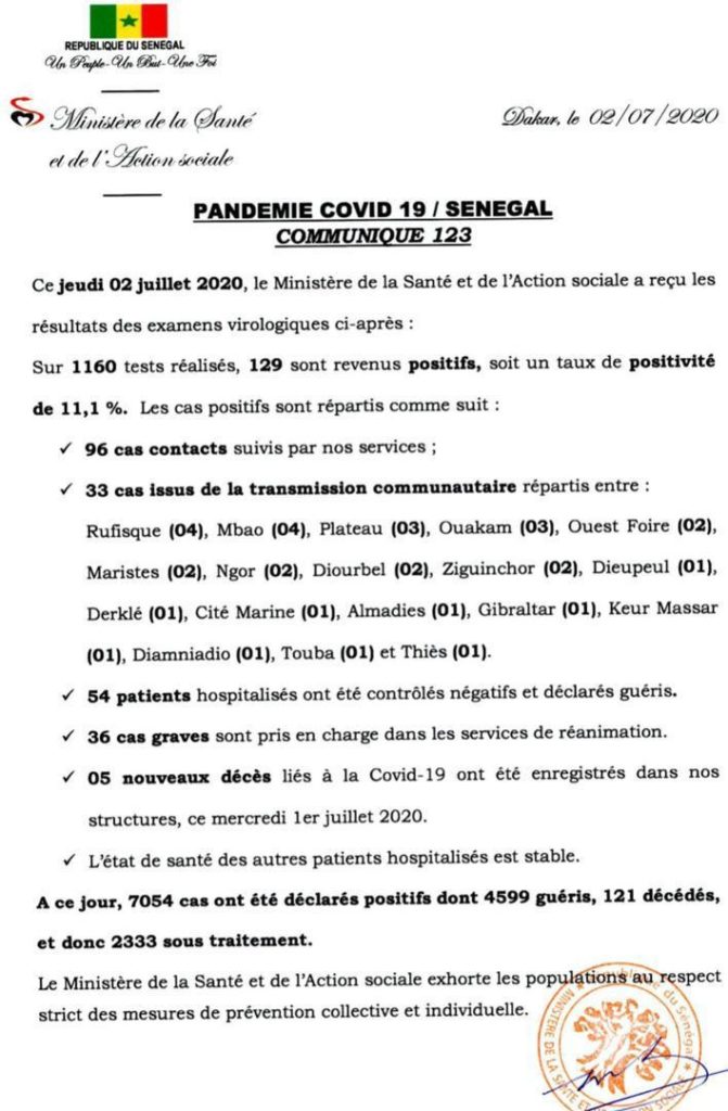 Sur 1160 tests réalisés, 129 sont revenus positifs au coronavirus soit un taux de positivité de 11,1%. Il s’agit de 96 cas contacts suivis et 33 cas issus de la transmission communautaire répartis comme suit : Rufisque (4), Mbao (4), Plateau (3), Ouakam (3), Ouest Foire (2), Maristes (2), Ngor (2), Diourbel (2), Ziguinchor (2), Dieuppeul (1), Derklé (1), Cité Marine (1), Almadies (1), Gilbraltar (1), Keur Massar (1), Diamniadio (1), Touba (1) et Thiès (1). 54 patients ont été testés négatifs et déclarés guéris. 36 cas graves sont pris en charge dans les services de réanimation. 5 nouveaux décès liés à la Covid-19, enregistrés. A ce jour, le Sénégal compte 7054 cas positifs dont 4599 guéris, 121 décès et 2333 encore sous traitement.