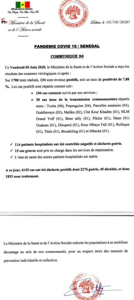 Sur 1700 tests réalisés, 134 sont revenus positifs au coronavirus soit un taux de positivité de 7,88%. Selon Dr Aloyse Diouf, il s’agit de 104 cas contacts suivis et 30 cas issus de la transmission communautaire répartis comme suit : Touba (6), Popenguine (4), Parcelles Assainies (3), Guédiawaye (3), Malika (2), Cité Keur Khadim (1), HLM Grand Yoff (1), Béne Tally (1), Pikine (1), Hann (1), Ouakam (1), Dieuppeul (1), Keur Mbaye Fall (1), Rufisque (1), Thiès (1), Bounkiling (1) et Mbacké (1). 114 patients ont été testés négatifs et déclarés guéris.