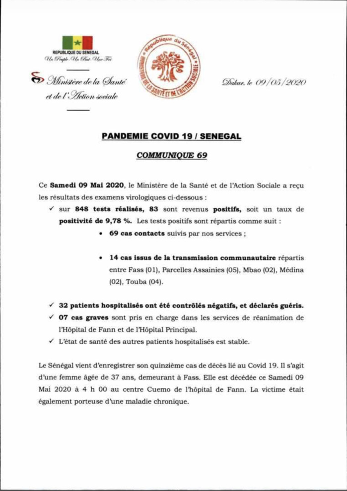 Sur 848 tests réalisés, 83 sont revenus positifs au coronavirus soit un taux de positivité de 9,78 %. Selon Dr Aloyse Waly Diouf, porte-parole du ministère de la Santé, il s’agit de 69 cas contacts suivis et 14 cas issus de la transmission communautaire répartis comme suit : 32 patients ont été testés négatifs et déclarés guéris. Le texte relève que 7 cas graves sont pris en charge dans les services de réanimation à Fann et à l’hôpital Principal. A ce jour, précise Dr Diouf, le Sénégal compte 1634 cas positifs dont 643 guéris, 15 décès, 1 évacué et 975 encore sous traitement. La prise en charge extra hospitalière a débuté et concerne les patients positifs asymptotiques, âgés de moins de 50 ans et ne souffrant d’aucune autre maladie. Ils seront suivis dans des lieux aménagés pour leur traitement par un personnel médical qualifié.