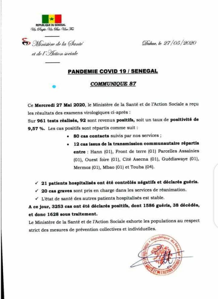 Sur 961 tests réalisés, 92 sont revenus positifs au coronavirus soit un taux de positivité de 9,57%. Selon Dr Marie Khemesse Ngom Ndiaye, il s’agit de 80 cas contacts suivis et 12 cas issus de la transmission communautaire répartis comme suit :
