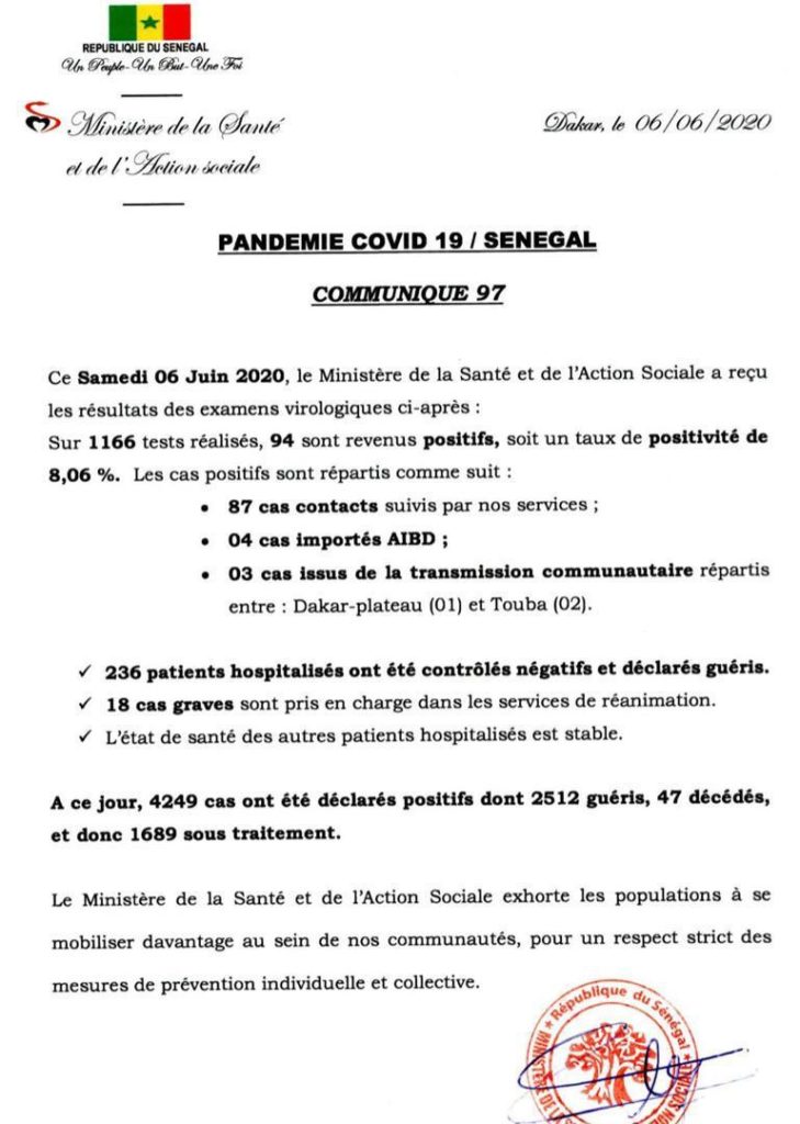 Sur 1166 tests réalisés, 94 sont revenus positifs au coronavirus soit un taux de positivité de 8,06%. Selon Dr Marie Khemesse Ngom Ndiaye, il s’agit de 87 cas contacts suivis 4 cas importés (Aéroport International Blaise Diagne) et 3 cas issus de la transmission communautaire répartis comme suit : Dakar-Plateau (1) et Touba (2). 236 patients ont été testés négatifs et déclarés guéris. Elle a ajouté que 18 cas graves sont pris en charge dans les services de réanimation. A ce jour, le Sénégal compte 4249 cas positifs dont 2512 guéris, 47 décès et 1689 encore sous traitement.