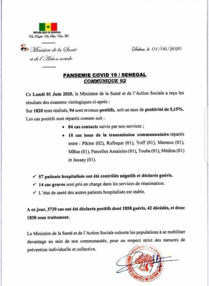 Sur 1820 tests réalisés, 94 sont revenus positifs au coronavirus soit un taux de positivité de 5,15%. Selon Dr Aloyse Waly Diouf, il s’agit de 84 cas contacts suivis et 10 cas issus de la transmission communautaire répartis comme suit : 57 patients ont été testés négatifs et déclarés guéris.