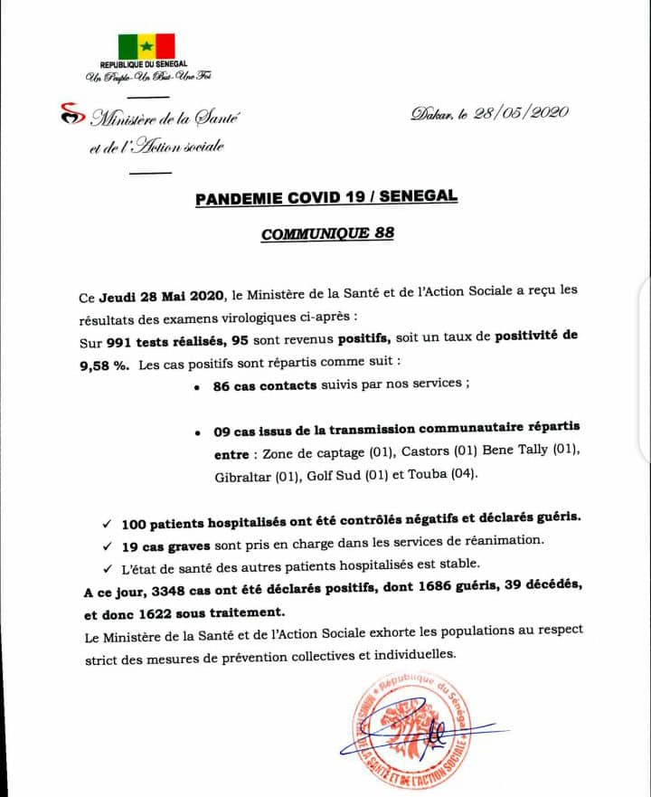 Sur 991 tests réalisés, 95 sont revenus positifs au coronavirus soit un taux de positivité de 9,58 %. Selon Dr Marie Khemesse Ngom Ndiaye, il s’agit de 86 cas contacts suivis et 9 cas issus de la transmission communautaire répartis comme suit :