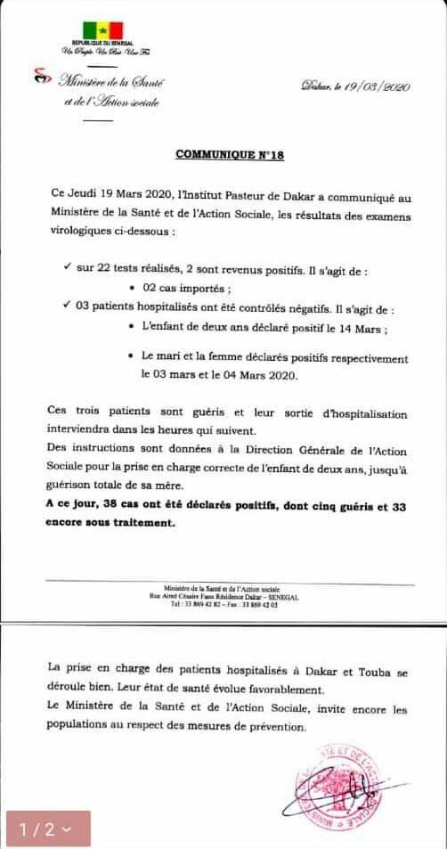 Jusqu’à la date du jeudi 19 mars 2020, le Sénégal compte 38 cas testés positifs au coronavirus. C’est ce qu’a déclaré hier le ministère de la Santé et de l’Action sociale.