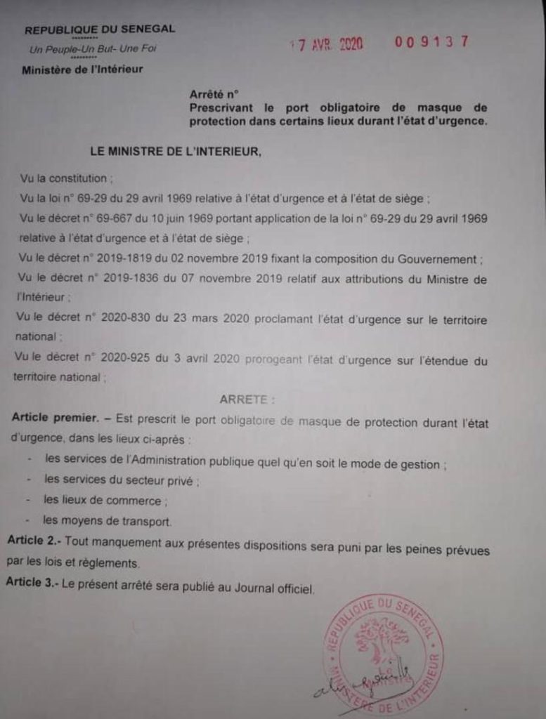 Dans le cadre de la lutte contre la transmission du covid-19, le ministre de l’Intérieur, Aly Ngouille Ndiaye, a pris, ce dimanche, un arrêté prescrivant le port obligatoire de masque dans certains lieux pendant toute la durée de l’état d’urgence.