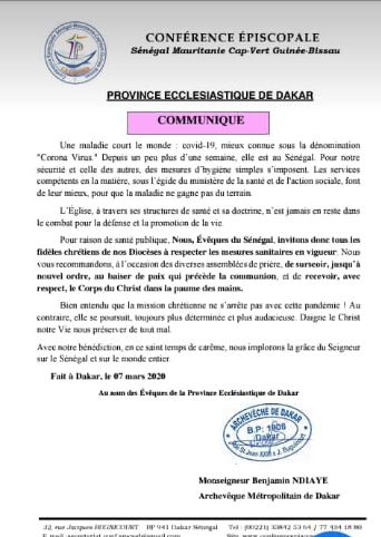 Pour raison de santé publique, Nous, Évêques du Sénégal, invitons donc tous les fidèles chrétiens de nos Diocèses à respecter les mesures sanitaires en vigueur. Nous vous recommandons, à l’occasion des diverses assemblées de prière, de surseoir, jusqu’à nouvel ordre, au baiser de paix qui précède la communion, et de recevoir le Corps du Christ dans la paume des mains.
