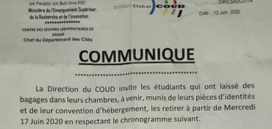Dans le communiqué, ci-dessous, la Direction des œuvres universitaires de Dakar informe ses locataires qu’ils sont invités à venir récupérer leurs bagages laissés dans leurs chambres.