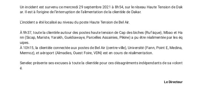 Dans la note ci-dessous, la Senelec revient sur l’incident qui a provoqué des coupures chez certains de ses de Dakar ce mercredi.