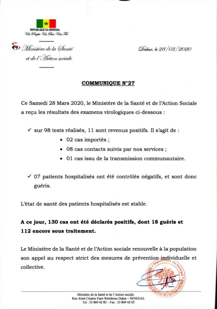 Sur 98 tests réalisés par les services d’examens virologiques en date de samedi 28 mars 2020, 11 sont revenus positifs. Le ministre de la Santé et de l’action sociale, Abdoulaye Diouf Sarr, qui a fait le point il y a quelques minutes, précise qu’il s’agit de 2 cas sont importés et 8 cas contacts suivis par ses services et d’un cas issu de la transmission communautaire. Note positive, le ministre a déclaré que “sept patients hospitalisés ont été contrôles négatifs sont guéris”.