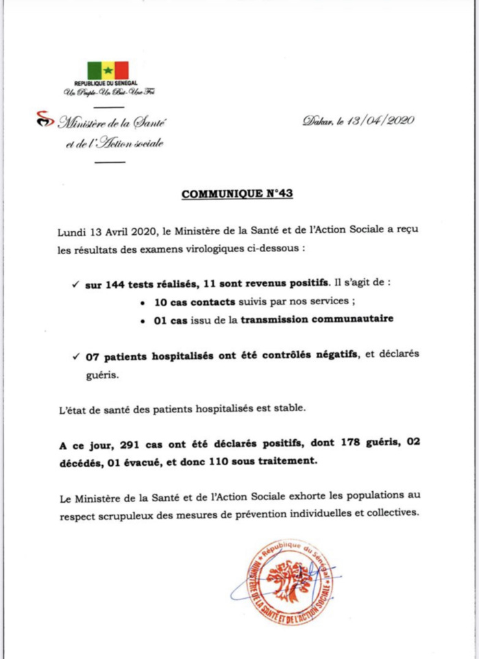 A ce jour, le Sénégal a enregistré 291 cas positifs dont 178 personnes guéries et 110 sous traitement. Il y a également eu deux décès.