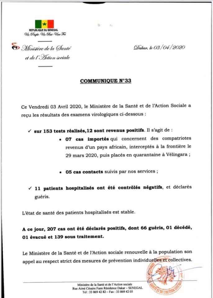 Il s’agit, selon lui, de 7 cas importés dont 7 concernent des compatriotes revenus d’un pays africain interceptés à la frontière le 29 mars 2020 puis placés en quarantaine à Vélingara. Les 5 autres sont des contacts suivis par les services du ministère. Se refèrer au document, ci-dessous.