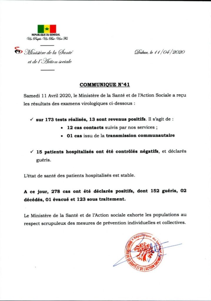 Sur 173 tests effectués, 13 nouveaux cas positifs au Covid-19 au Sénégal. Selon le Abdoulaye Diouf Sarr, qui a donné les résultats des examens virologiques de ce samedi 11 avril, il s’agit de 12 cas contacts suivis par les services dudit ministère et d’un (1) issu de la transmission communautaire.