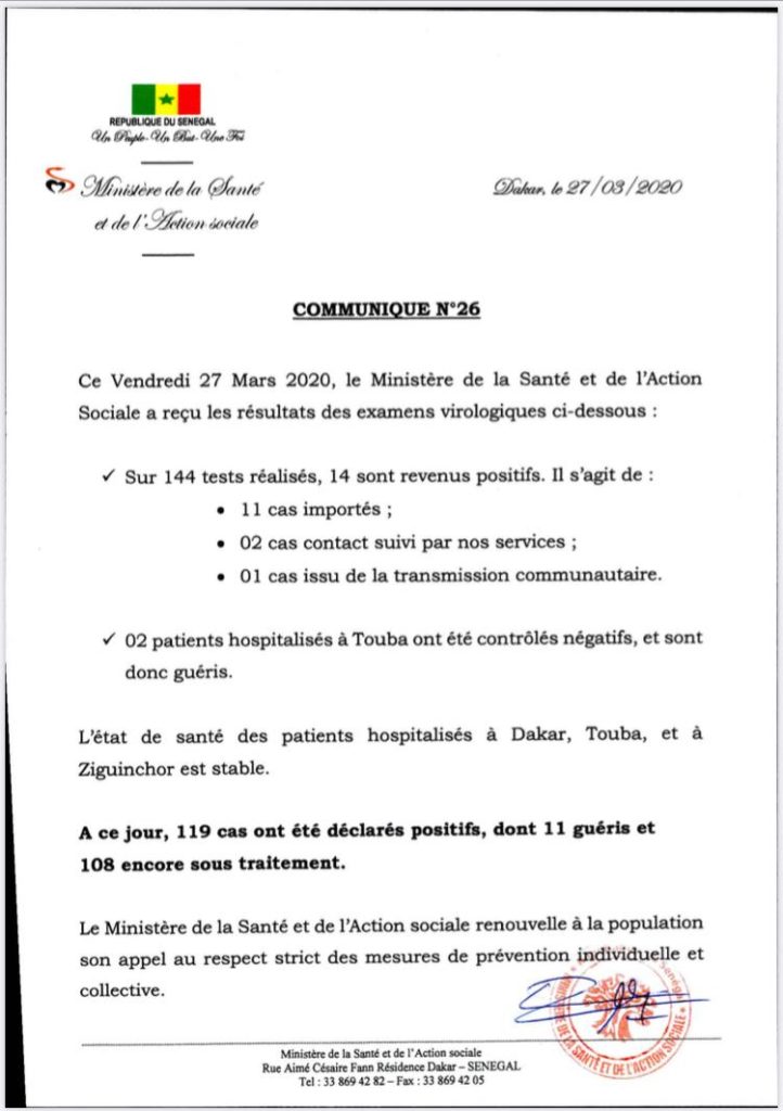 Actualités Santé Covid-19 : 14 nouveaux cas au Sénégal (document) 27 mars 202027 mars 2020 jotalixibar Partager l'article Ce vendredi, le Sénégal a enregistré 14 nouveaux cas positifs de covid-19. Partager : Cliquer pour partager sur X(ouvre dans une nouvelle fenêtre) X Cliquez pour partager sur Facebook(ouvre dans une nouvelle fenêtre) Facebook Cliquez pour partager sur WhatsApp(ouvre dans une nouvelle fenêtre) WhatsApp Share Facebook Twitter Pinterest Linkedin