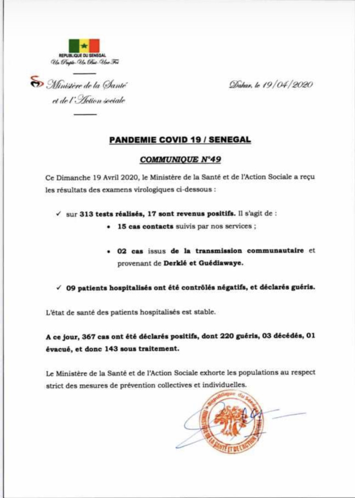 Sur 313 tests réalisés, 17 sont revenus positifs au coronavirus. Il s’agit de 15 cas contacts suivis et 2 cas issus de la transmission communautaire (Derklé et Guédiawaye). 9 patients ont été testés négatifs et déclarés guéris, souligne la Directrice de la Santé, Marie Khémès Ngom Ndiaye ce dimanche 19 avril 2020.