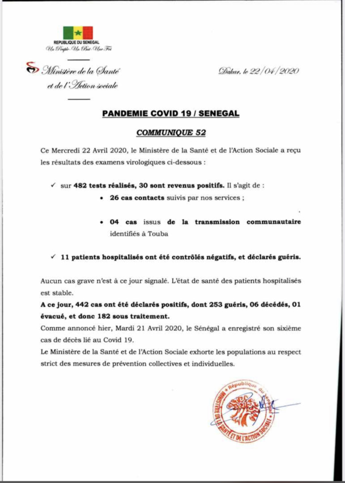 Dr Aloyse Diouf, porte-parole du ministère de la Santé et de l’Action sociale, faisant le point du jour ce mercredi, a déclaré ce mercredi 22 avril 2020, que sur 482 tests réalisés, 30 sont positifs dont 4 issus de la transmission communautaire. Onze malades sont déclarés guéris. En somme, le Sénégal compte 442 cas positifs dont 253 guéris, 6 décès, 1 évacué et 182 encore sous traitement.