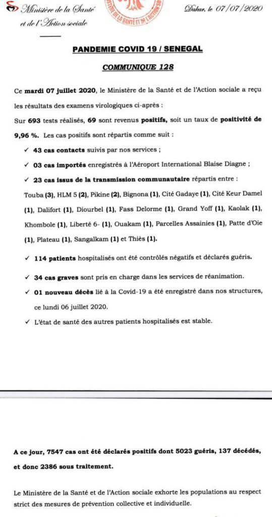 Sur 693 tests réalisés, 69 sont revenus positifs. Selon Dr Mamadou Ndiaye, il s’agit de 43 cas contacts suivis par les services du ministère de la Santé, 3 cas importés, 23 cas issus de la transmission communautaire. Par ailleurs, 114 patients sont testés négatifs et déclarés guéris. Trente-quatre (34 ) cas graves sont également pris en charge dans les services de réanimation de l’hôpital de Fann et de l’hôpital principal de Dakar. L Directeur de la Prévention précise qu’un nouveau décès liés à la covid-19 ont été enregistrés ce samedi 4 juillet. L’état de santé des patients hospitalisés dans les hôpitaux évolue positivement. A ce jour, le Sénégal a enregistré 7547 cas positifs à la Covid-19 dont 5023 guéris, 137 morts, 1 évacué et 2386 personnes sont encore sous traitement.